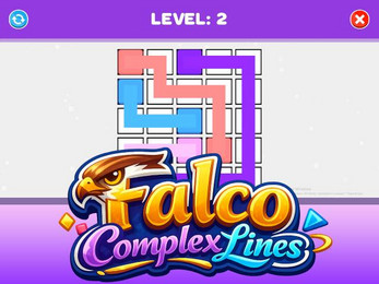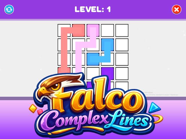 Falco Complex Lines - a logic puzzle game where you connect colored elements and draw lines across a 5 by 5 grid, carefully planning each move and avoiding blocked paths.